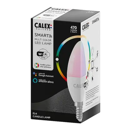 Je kunt er ook voor kiezen om meerdere Calex smart lampen te koppelen aan onder andere een Google Home of Amazon Alexa apparaat. Dit maakt het mogelijk om Calex verlichting via jouw eigen stemgeluid te bedienen. Door het geven van simpele instructies als; ‘Hey Google, dim de lamp eettafel’, heb je dit al snel geregeld! Tevens is deze kaarsvormige E14 Calex Smart verlichting te bedienen via een officiële Calex Smart afstandsbediening. Verder werkt deze Calex lamp op een wandschakelaar, maar niet op een dimmerschakelaar. Ben je op zoek naar Smart verlichting met bijvoorbeeld een andere fitting of in een andere vorm? Klik dan hier om ons volledige assortiment te bekijken!