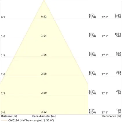De gradenbundel geeft informatie over hoe breed het licht wordt uitgestraald. Dit zit tussen de 0 en 360 graden (D). Hoe kleiner de hoek, hoe specifieker de lichtbundel is. Over het algemeen is een smalle gradenbundel perfect voor sfeer- of accentverlichting, terwijl een brede gradenbundel ideaal is om grote oppervlaktes te verlichten.