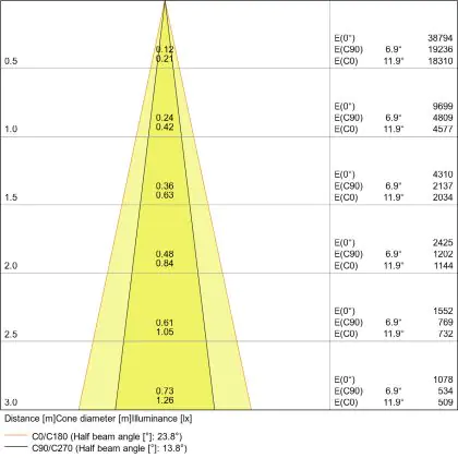 De lichtopbrengst en de gradenbundel spelen een grote rol. Zo geeft de lichtopbrengst van 3350 Lumen in combinatie met de 24° stralingshoek deze inbouwspot een specifieke toepassing. Kort samengevat is een lichtintensiteit van maximaal 400 Lumen ideaal voor accentverlichting, terwijl hogere waardes goed gebruikt kunnen worden als basisverlichting. Over het algemeen geldt: hoe breder de gradenbundel, hoe geschikter deze is door basisverlichting. Dit komt doordat het licht over een groter oppervlak wordt verspreid. Smallere gradenbundels (tot 40°) kunnen echter bij hoge plafonds ook goed tot hun recht komen als algemene verlichting.