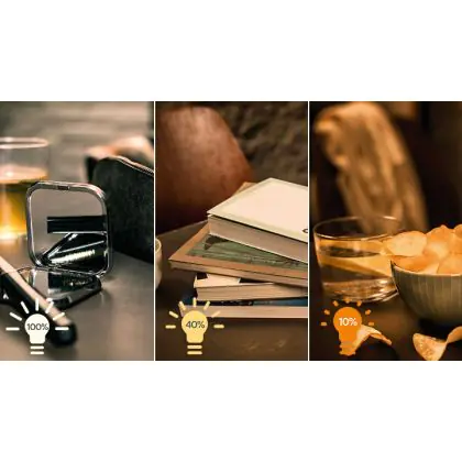 - 40% licht met een lichtkleur van 2500 kelvin, warmer wit licht