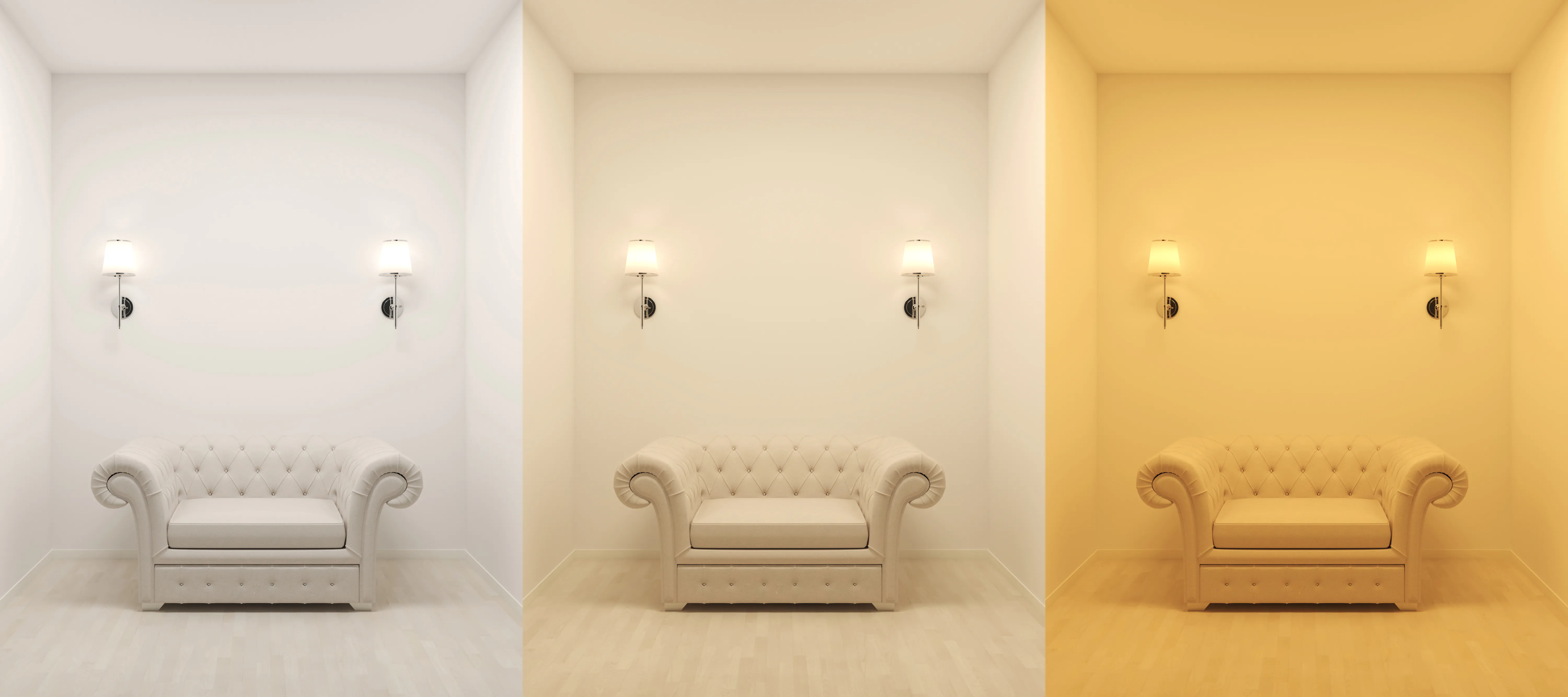 De kleurtemperaturen 'extra warm wit' en 'warm wit' zijn qua tint aangenaam en zorgen voor een prettige sfeer. LED verlichting in deze lichtkleuren is als we kijken naar de kleur licht wat meer geel en/of oranje te noemen. Wanneer we het hebben over koud licht, dan gaat het vooral over 'koel wit' en 'daglicht'. In tegenstelling tot warm licht zie je bij deze lichtkleuren in het licht een wat meer blauwe tint terug. De foto hiernaast laat dit goed zien. Aan de linkerkant zie je dat de ruimte is verlicht met 4000 Kelvin (koel wit). Dit zorgt voor een fris en natuurlijk effect. In het midden van de afbeelding is dezelfde ruimte verlicht met 3000 Kelvin (warm wit). Hier zie je al duidelijk het verschil qua tint. En helemaal rechts is de ruimte verlicht met LED verlichting in 2700 Kelvin (extra warm wit). Dat geeft qua lichtkleur het meest sfeervolle effect.